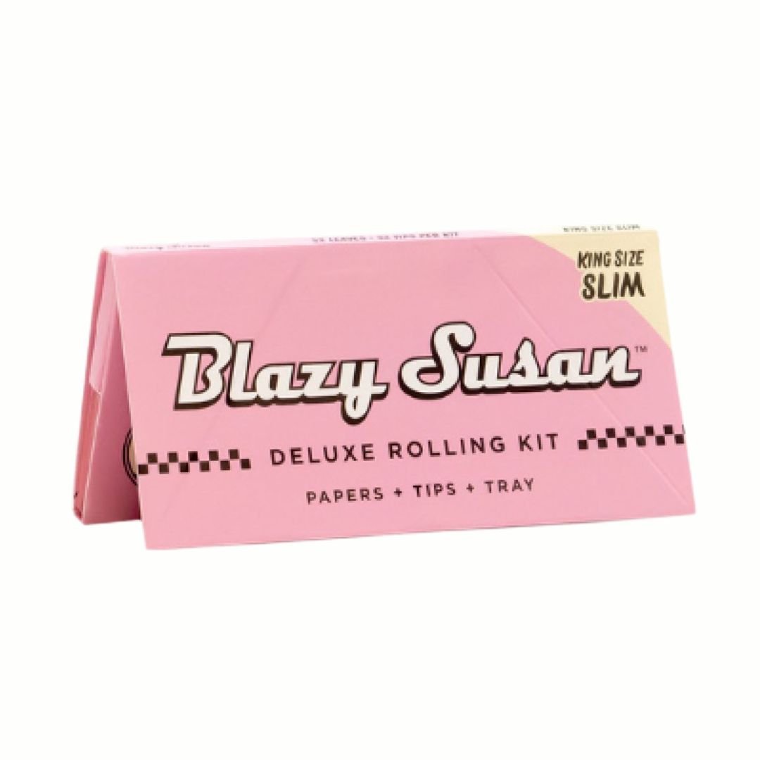 El Blazy Susan Deluxe Kit es un completo set todo en uno. Incluye un paquete de 32 papeles King Size Slim, un bloque de filtros y una práctica bandeja, ¡todo en un elegante color rosa!