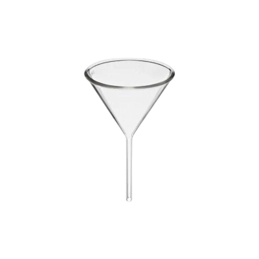 El embudo generalmente tiene la forma de 2 conos, un cono más grande en la parte superior recibe el flujo de líquido y el cono inferior sirve para canalizar el flujo entrante desde la parte superior al recipiente.