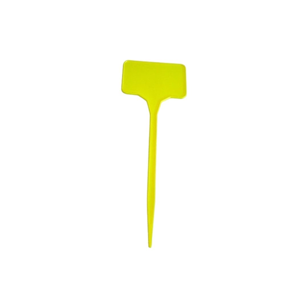 Etiqueta de plástico amarilla con superficie para escribir,se presentan en bolsas de 100 piezas.