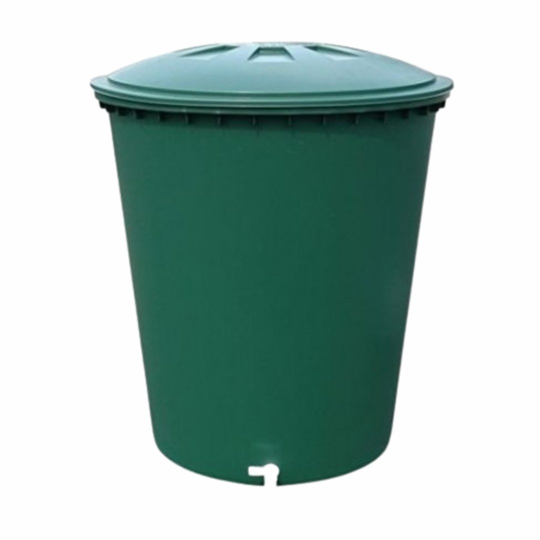 Depósito redondo de color verde con tapa, ideal para suministrar grandes cantidades de agua a tus plantas mediante riego por goteo, o para proporcionar agua en menor cantidad durante más tiempo.