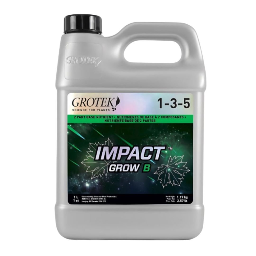 Impact Grow B de Grotek es un fertilizante base diseñado para cultivos hidropónicos de alto rendimiento durante la fase de crecimiento.